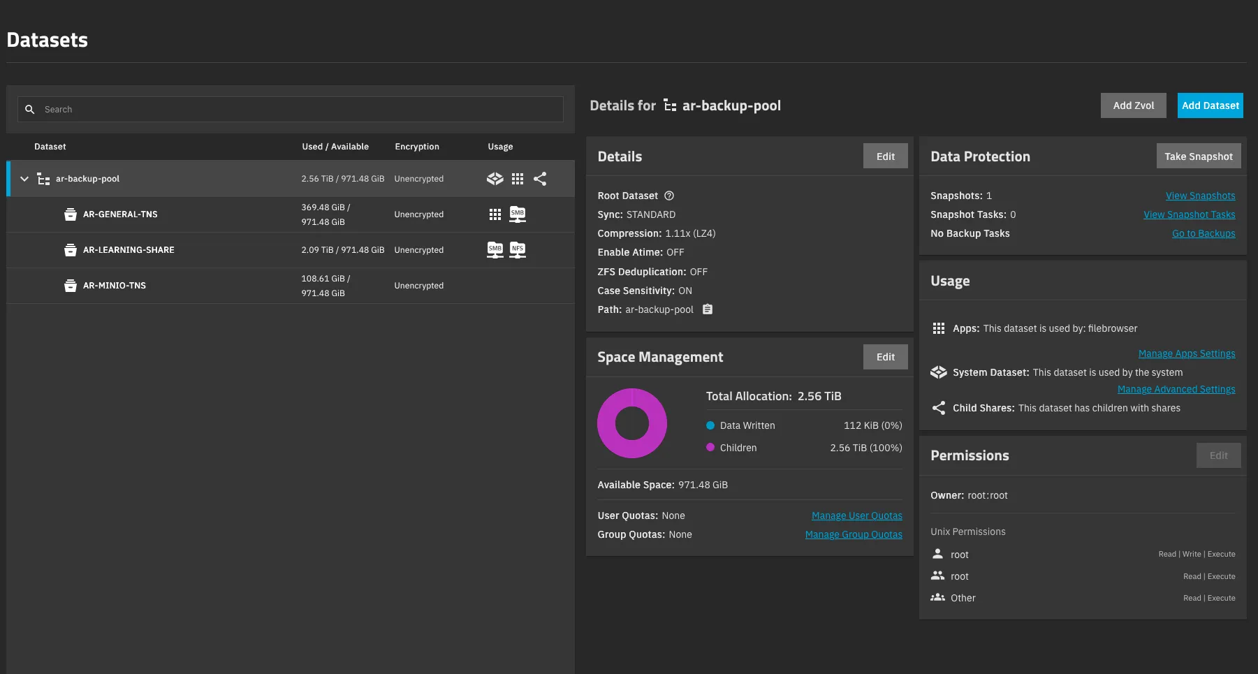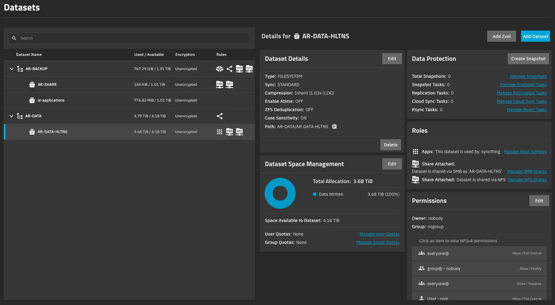 HL-TrueNAS is a TrueNAS Scale instance running as a VM on pve3 (covered in Part 1). It stores large files — media archives, system backups, and anything that needs raw capacity. Since these are single disks passed through from the host, there’s no redundancy in this pool. It’s not the place for irreplaceable data, but it works well for bulk storage where copies exist elsewhere.