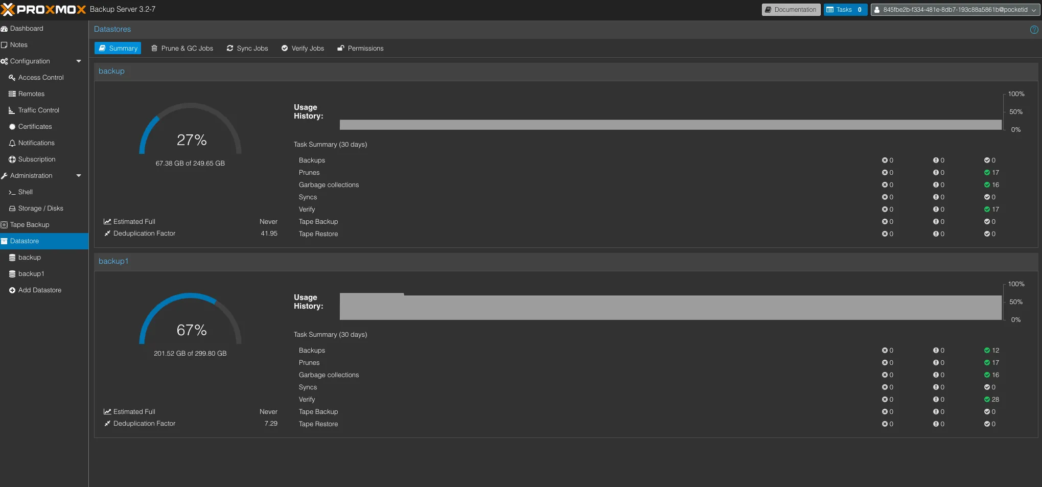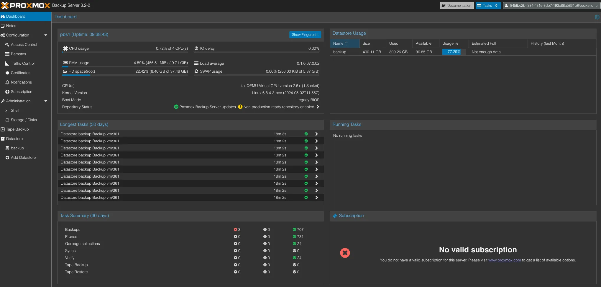 PBS1 runs as a VM with 400GB of storage, backing up selected PVE nodes. It stays in sync with PBS2 (on pve), so every backup here is replicated to a second copy on separate hardware.