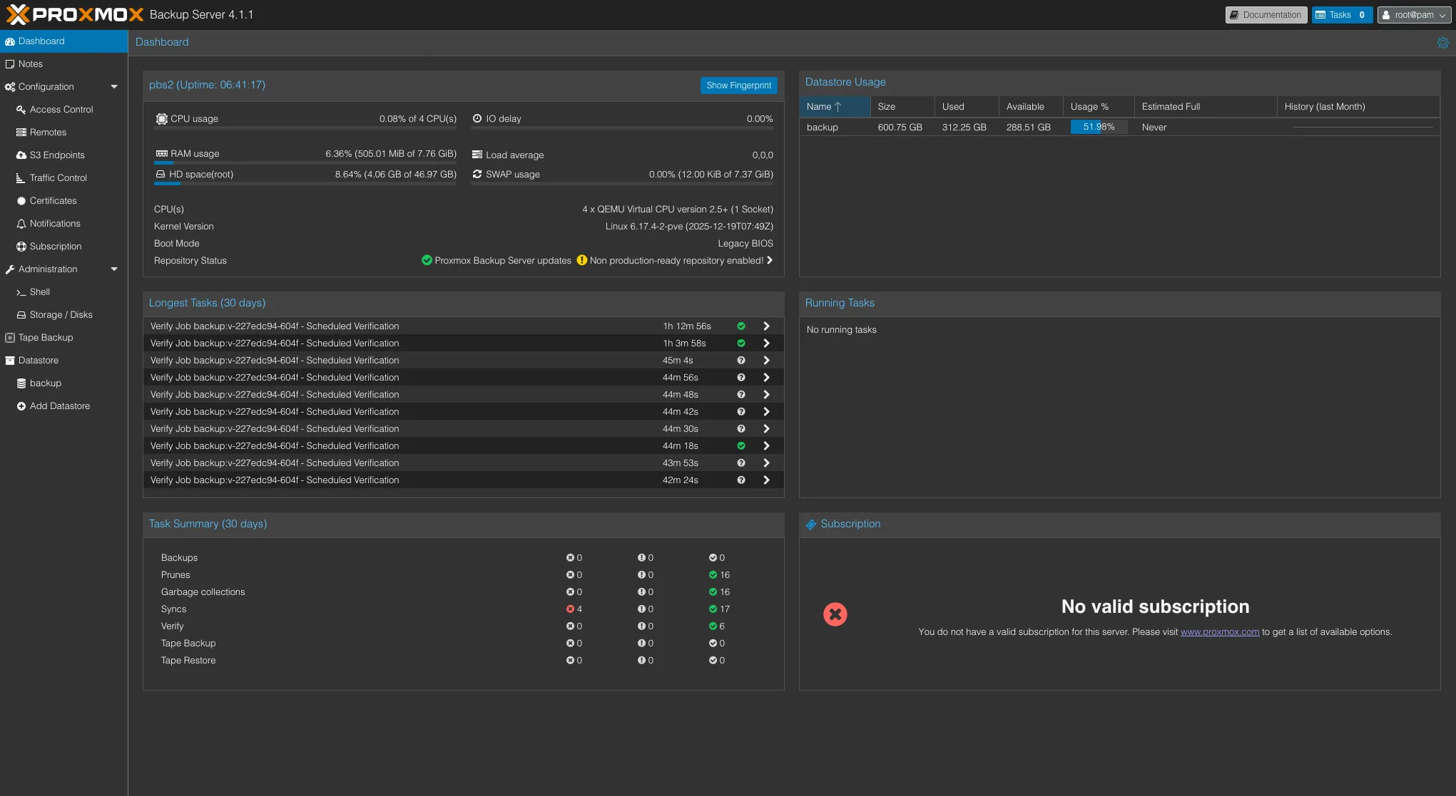 PBS2 runs as a VM on this node and stays in sync with PBS1 (on pve2). Every Proxmox backup that lands on PBS1 is replicated here, giving me a second copy of all VM and container backups on separate hardware. If PBS1 or pve2 has a disk failure, PBS2 still has the data.