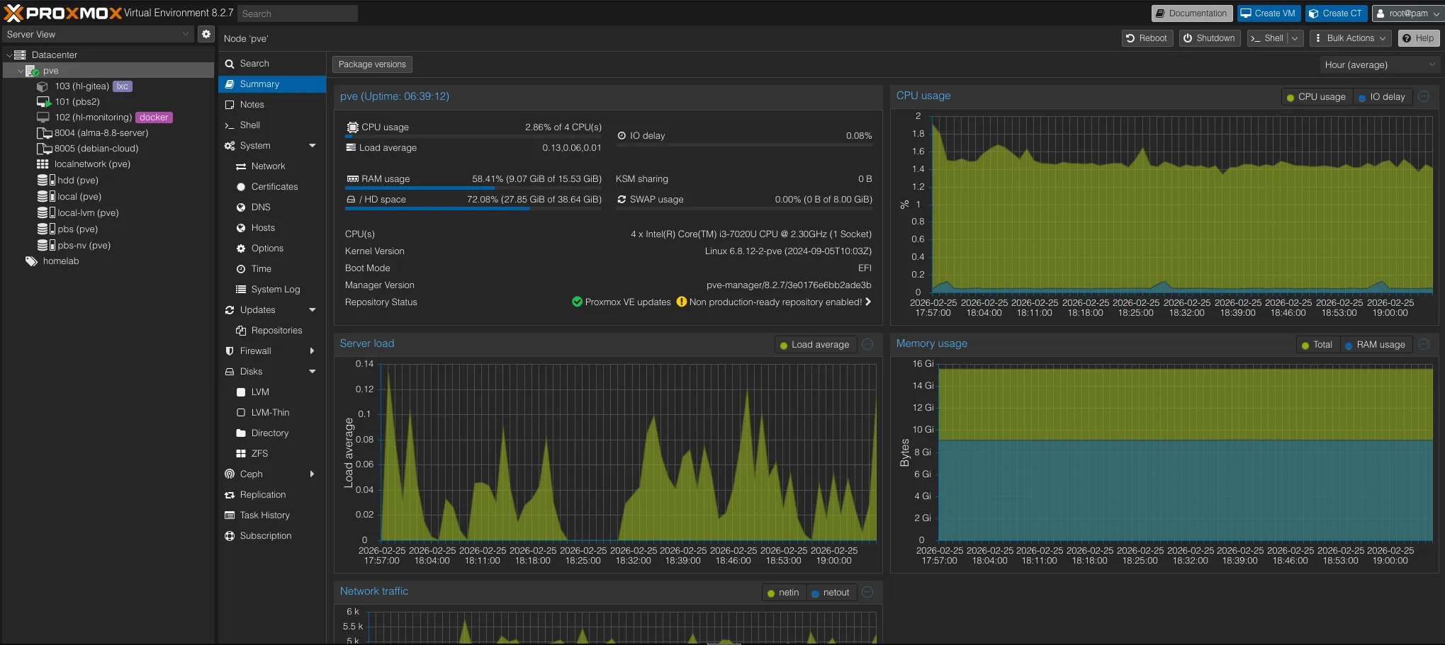 Jellyfin runs as an LXC container, mounting NFS shares from both Unraid and TrueNAS for its media libraries. The i5’s Quick Sync handles hardware transcoding efficiently — no dedicated GPU needed. This setup offloads transcoding from the hl-media stack on pve2, which manages downloading and organizing.