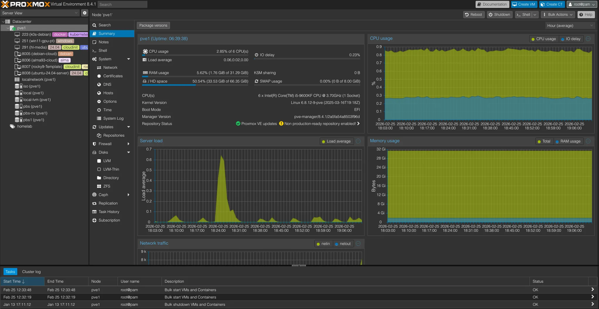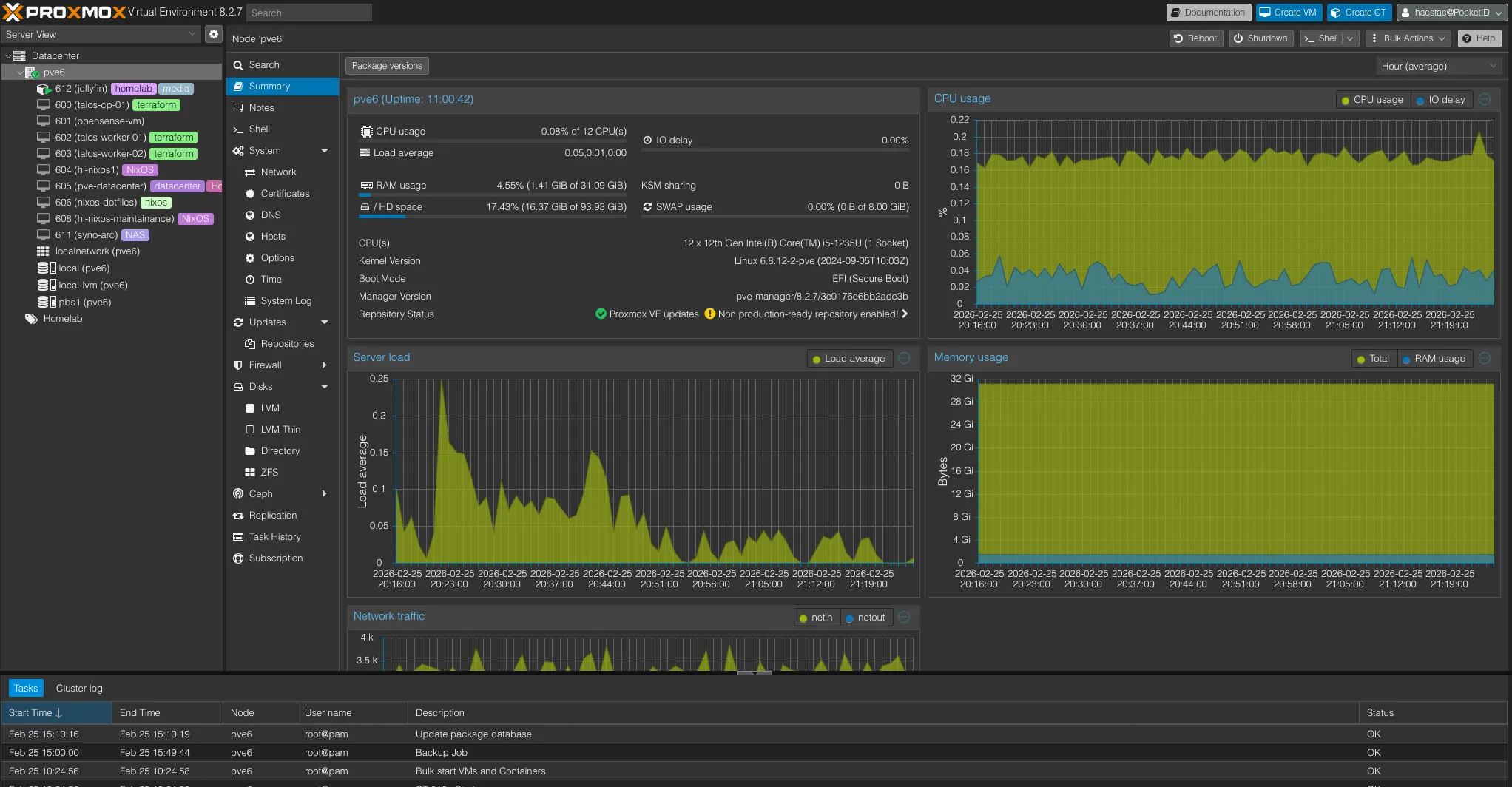 This node runs a 3-node Talos cluster for testing heavy-duty workloads. It’s separate from the K8s cluster on pve2 and is purpose-built for experimenting with Talos Linux as the immutable OS layer.