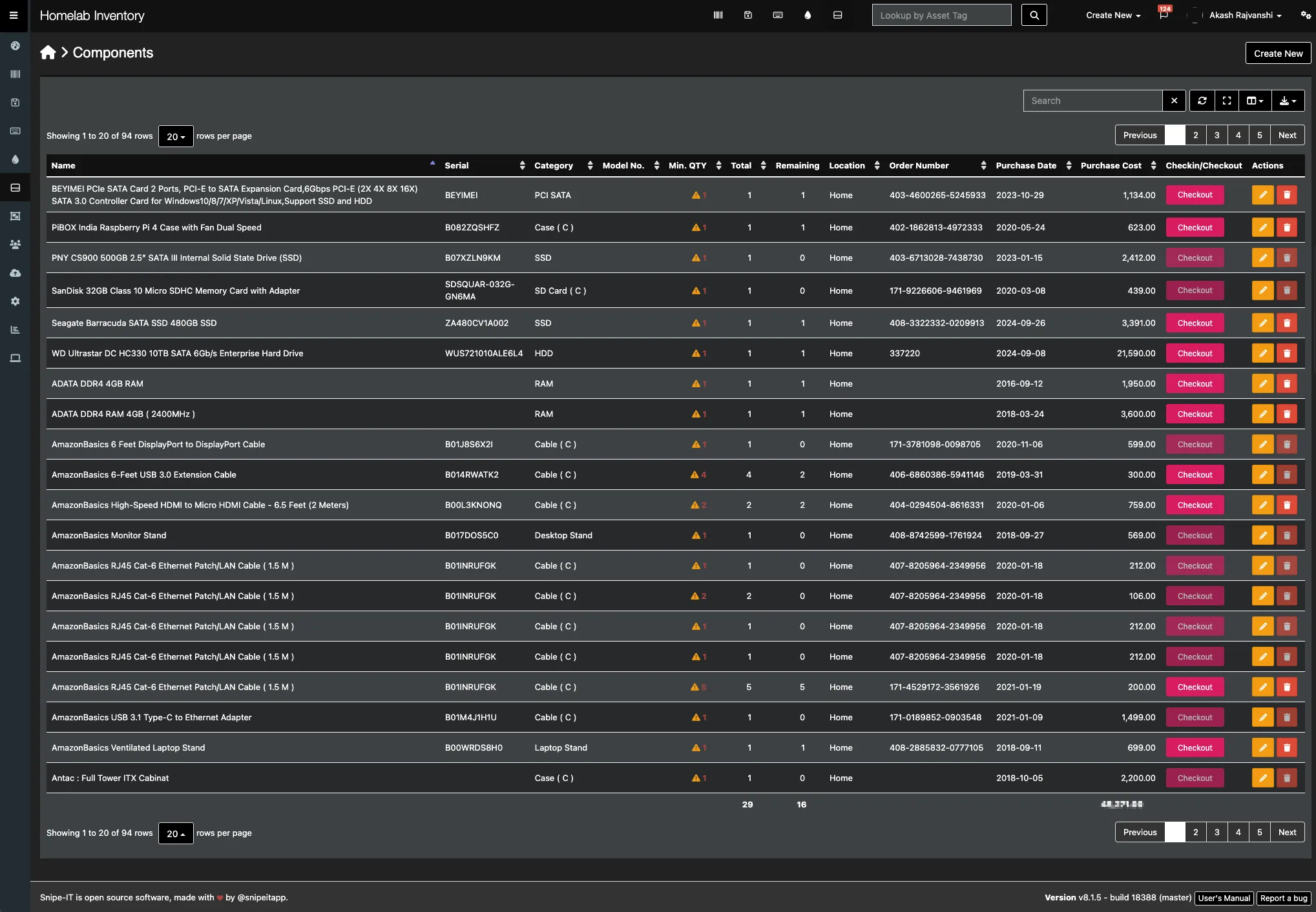- SnipeIT is my homelab inventory system, every component is tracked with its order number, purchase date, vendor, warranty status, and whether it’s deployed or available.