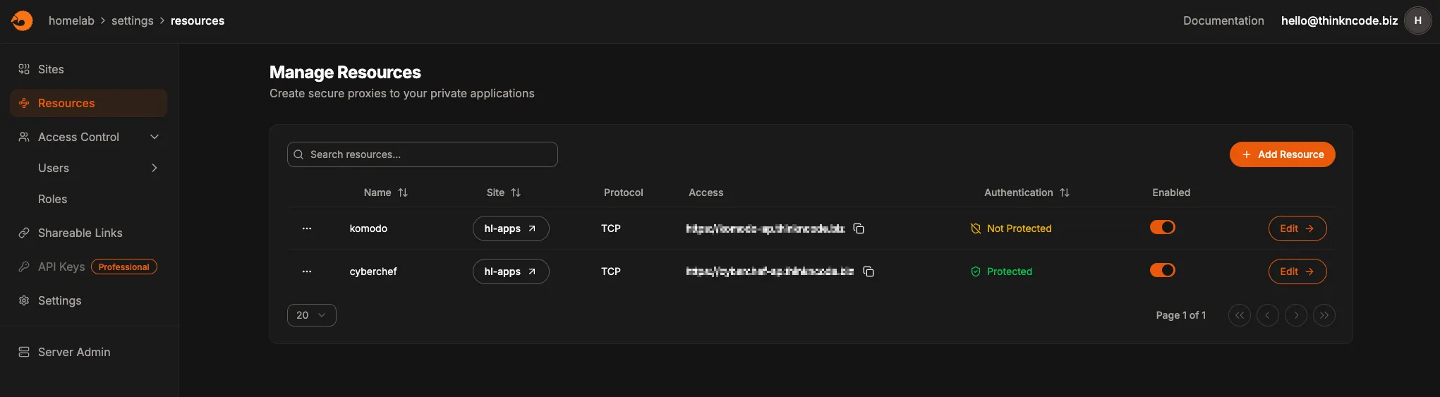 Pangolin runs on the same Hetzner VPS as Netbird. It is a reverse proxy, so services inside the homelab can be exposed externally via Pangolin without opening firewall ports or a public IP address. It is a self-hosted alternative to Cloudflare Tunnel, giving full control over the relay server.