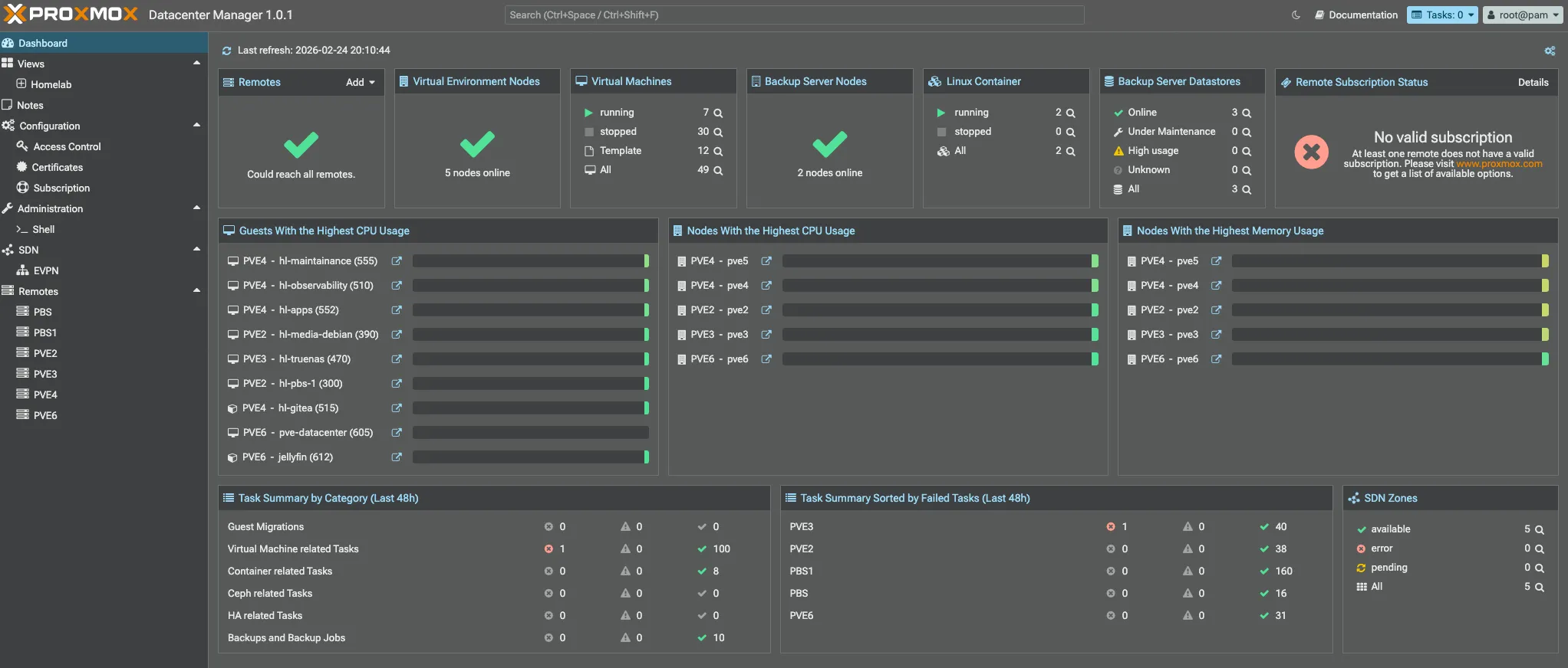 Below are the compute nodes. Every Proxmox instance runs in standalone mode for better manageability, except for pve4 and pve5, which are clustered together since both are NUCs and use little power.